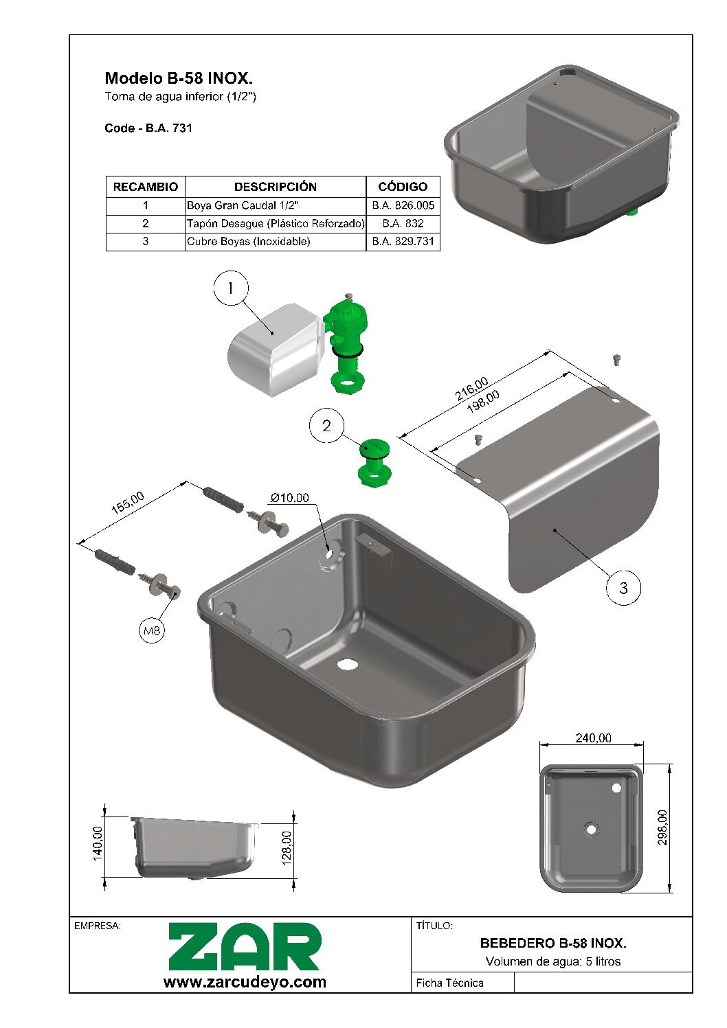 Tipo: Bebedero automático con sistema de llenado por flotador.