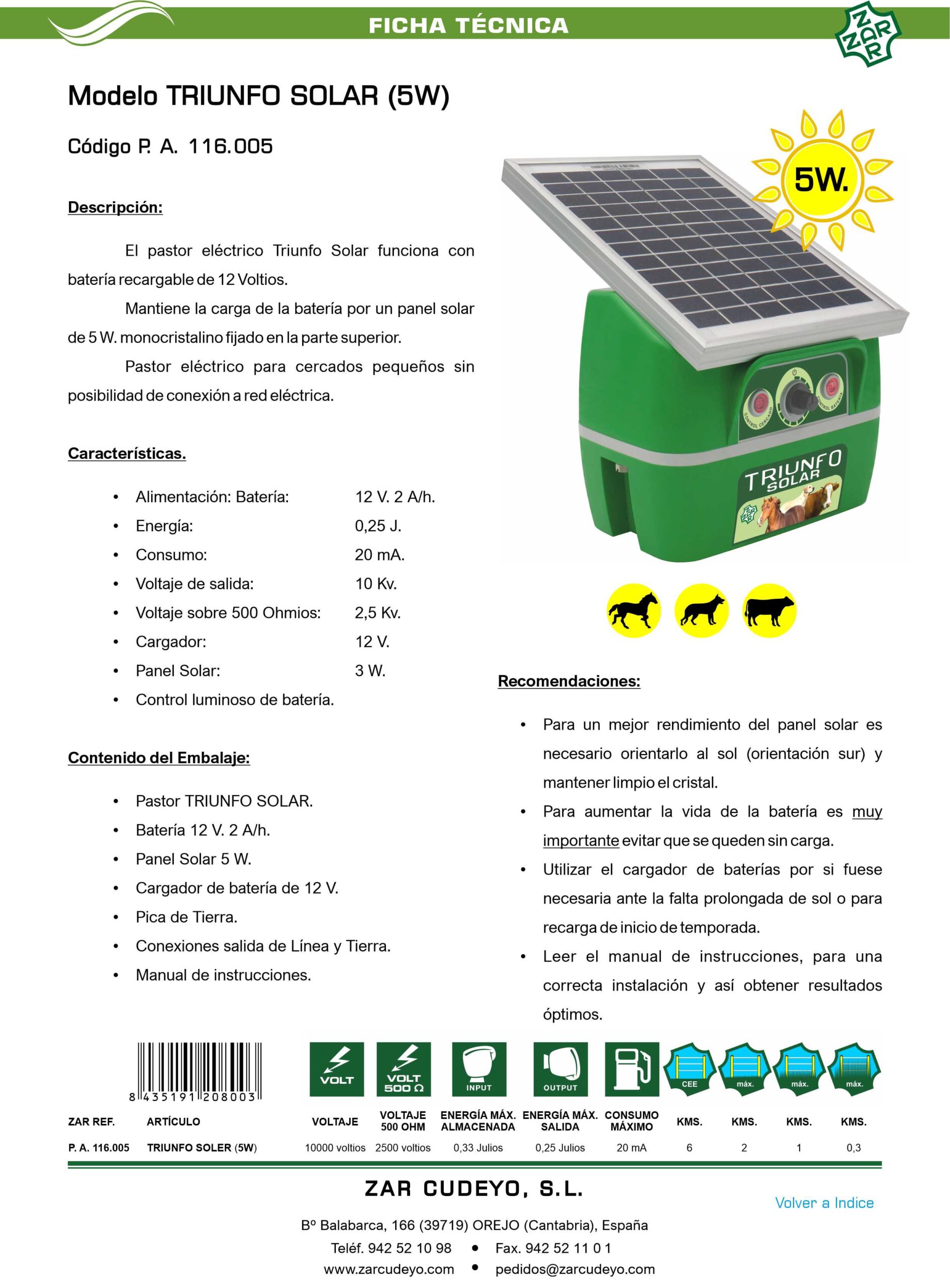 El Pastor Triunfo Solar (5W) – Código PA-116.005 es una solución eficiente, ecológica y autónoma para el control de cercas eléctricas en explotaciones ganaderas sin acceso a red eléctrica. Su panel solar de 5W garantiza una carga constante durante el día, ofreciendo funcionamiento continuo sin necesidad de recarga externa.